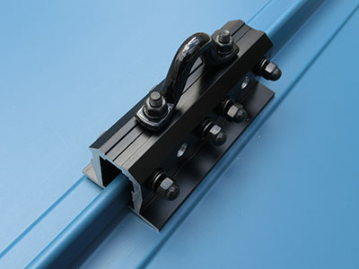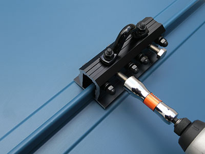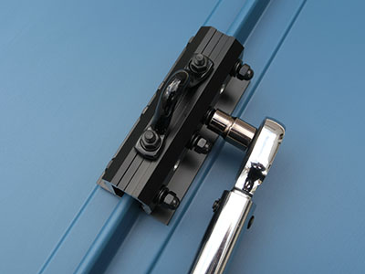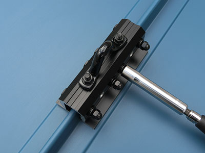 縦ハゼ部に安全金具を上から嵌め込み、備え付けのボルトナットをインパクトドライバー等で締め付ける(トルク:8N・m)ことで簡単に設置ができます。万一取外す場合は、固定ボルトを緩めるか外し、M8L40ボルトをネジ押し込むことで取外しできます。 ※注:安全金具の繰り返し使用はボルトやタップネジ部が潰れますので再利用は控えて下さい。